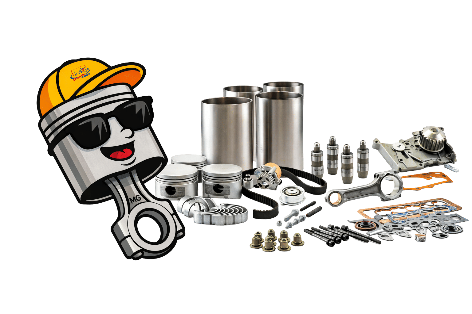 Pistones | Empaques | Anillos | Metales de Biela | Metales de centro| Metales de árbol | Kit de distribución | Válvulas | Camisas | Árbol de levas | VVT | Tornillos de cabeza | Bomba de aceite | Bomba de agua | Enfriadores | Balancines | Punterías | Guía de válvulas | Varilla de punterías | Tensores | Banda de tiempo | Silicones | Formador de juntas| Aceite sintético | Anticongelante |